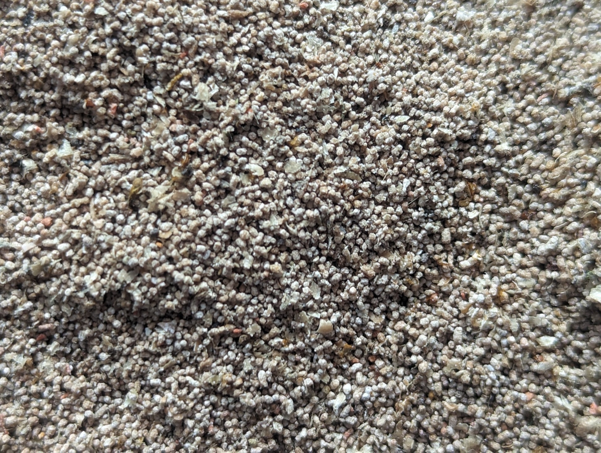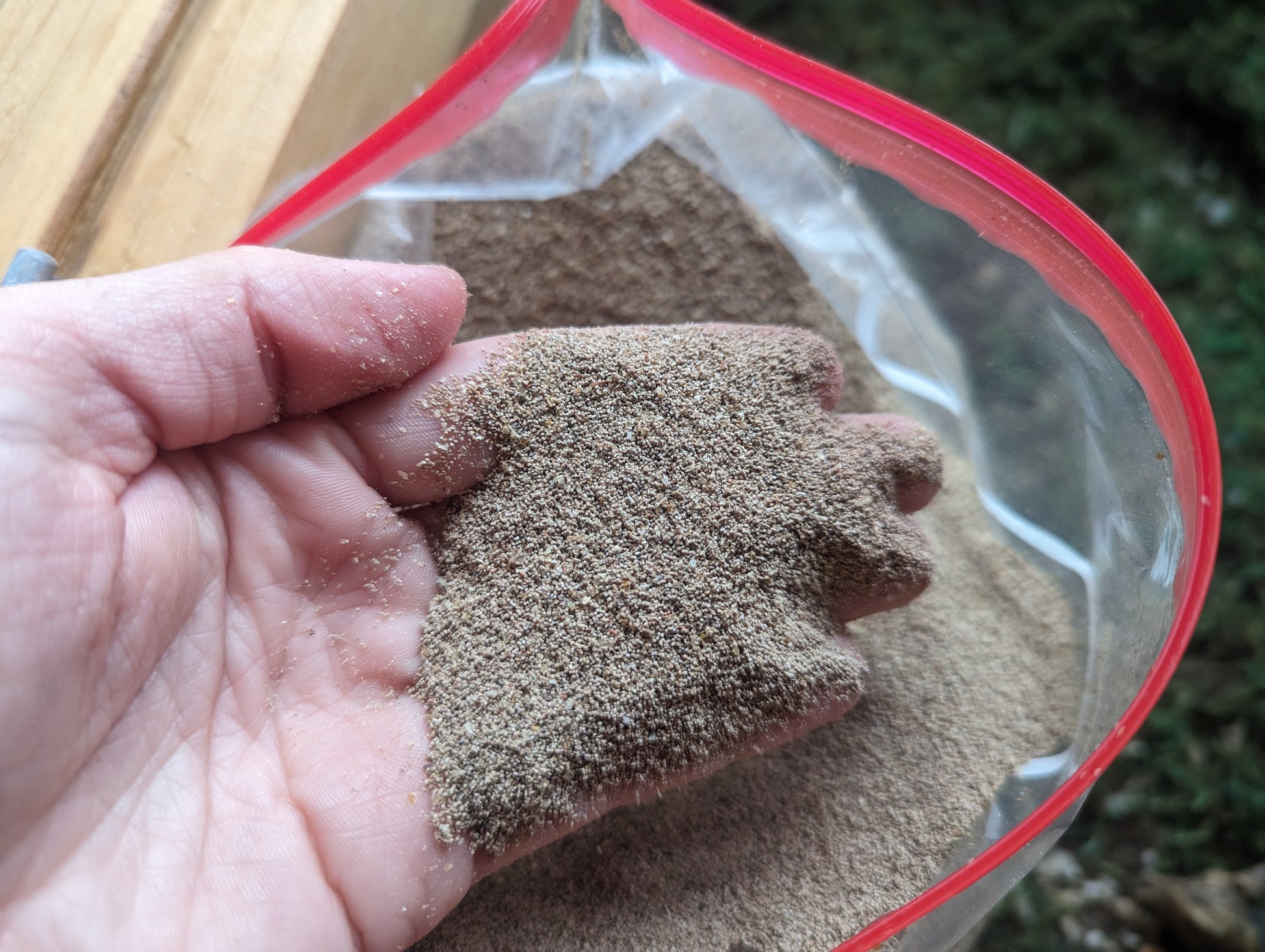 - Odorless and dry, with a sandy/powdery consistency + texture