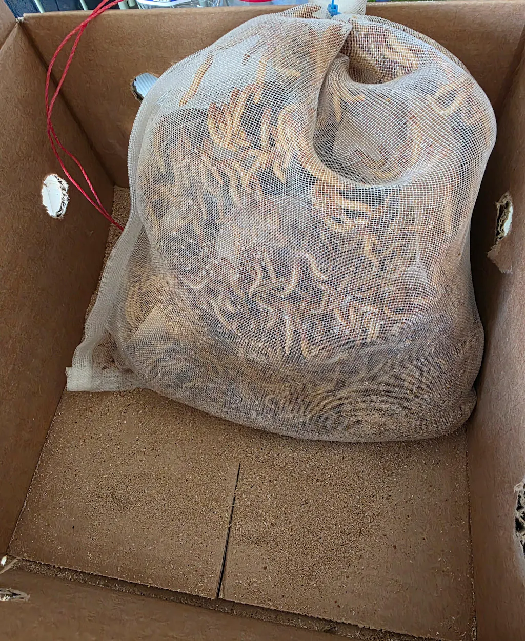 - If you are purchasing a larger quantity, such as 3k or more, we recommend using a plastic container to store them in longer-term. Mealworms cannot climb smooth plastic, so you don't even really need a lid - in fact, we do not recommend lidding them unless absolutely necessary, especially if you plan to store them in the fridge. A lid will trap moisture and can cause issues over time.